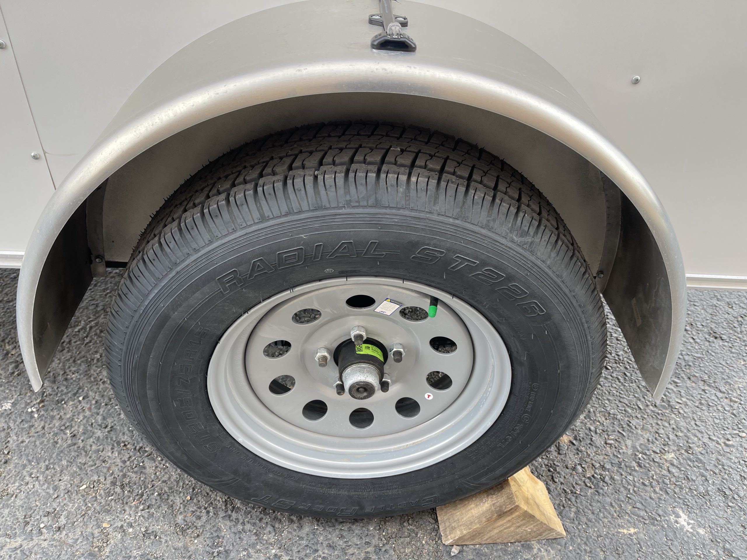 Axle & Wheels: Single 3.5K spring axle (no brakes) with a 4″ drop and EZ‑Lube hubs, rolling on ST205/75R15C radial silver mod wheels.