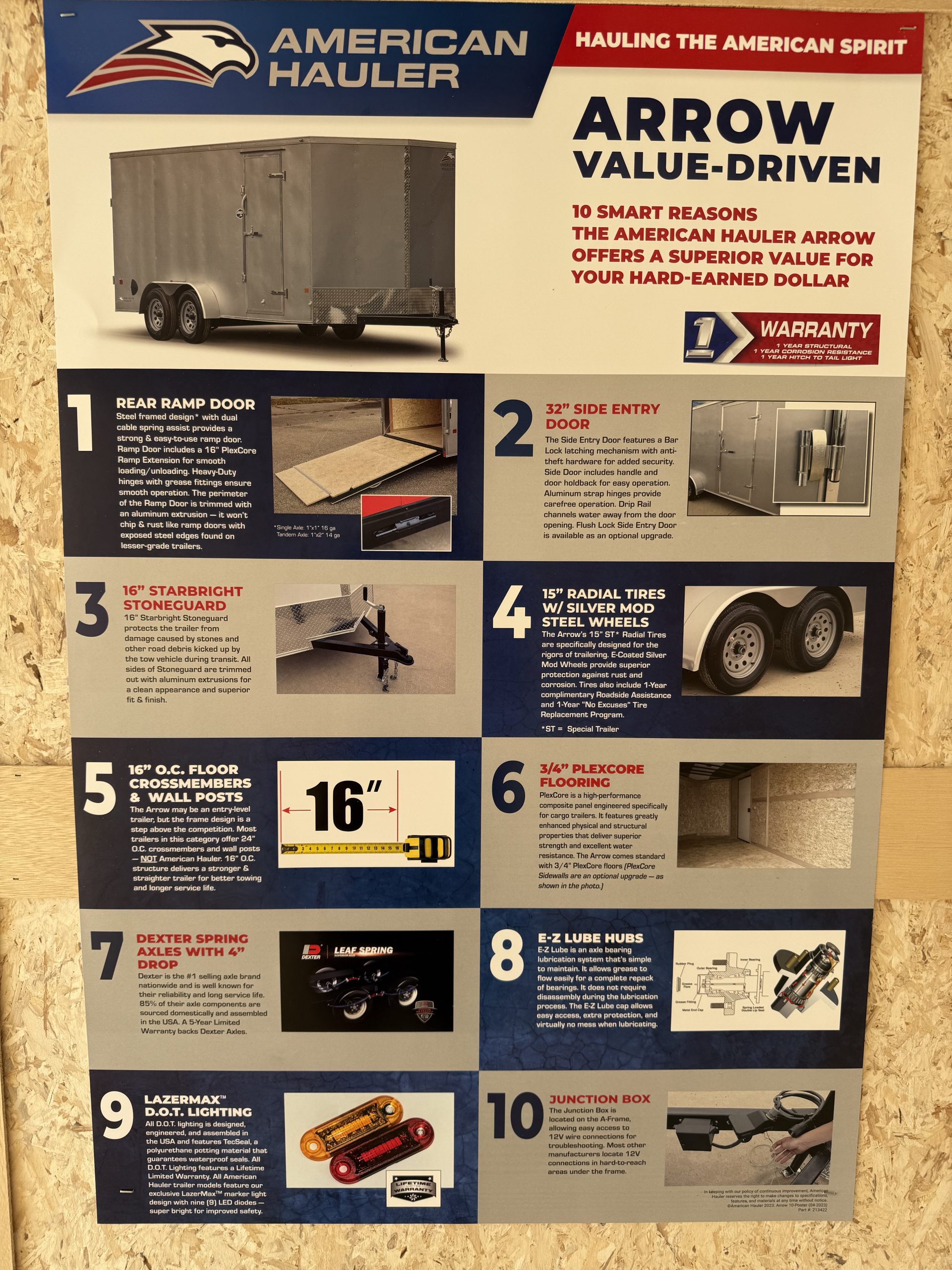 Backed by a 1‑year structural warranty, 1‑year hitch‑to‑taillight warranty, and 1‑year corrosion warranty.