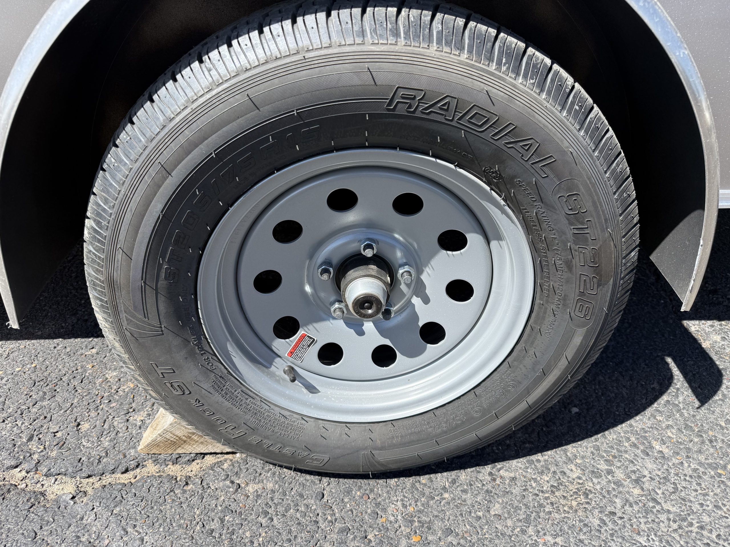 Single 3.5K spring axle (no brakes) with a 4″ drop and EZ‑Lube hubs, plus ST205/75R15 radial tires on silver mod wheels.